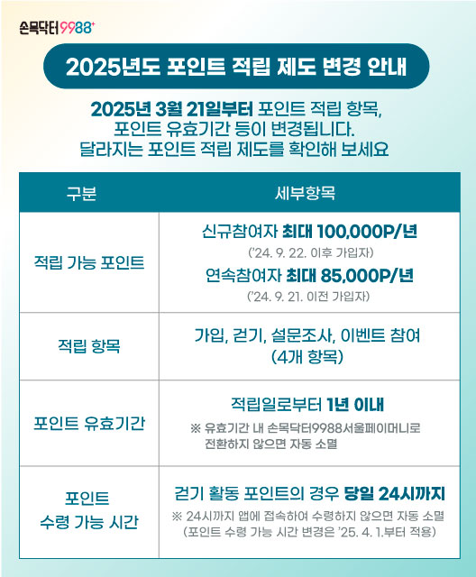서울시가 제공하는 스마트한 건강관리 프로그램, 손목닥터9988과 함께 꾸준한 건강 습관을 만들고 쏠쏠한 포인트 혜택까지 누려보시는 것은 어떨까요? 지금 바로 '손목닥터9988' 앱을 다운로드하고, 내 손안의 AI 건강비서와 함께 99세까지 팔팔한 건강 라이프를 시작해 보시기 바랍니다.