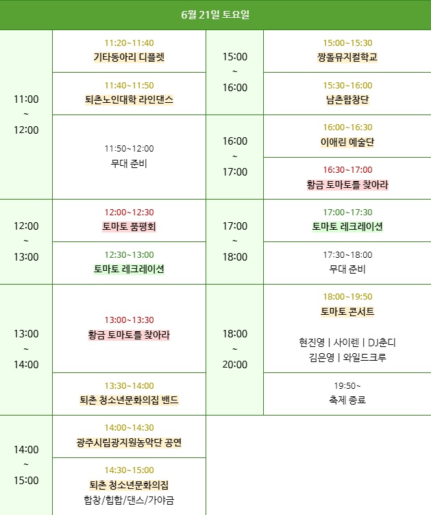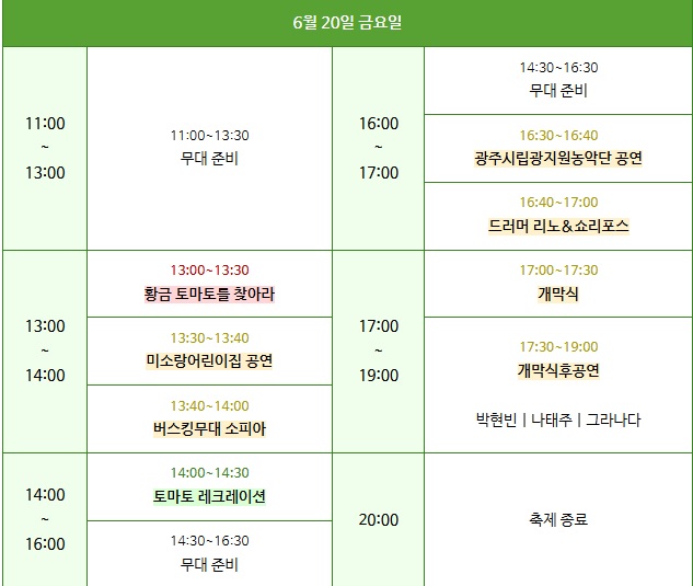 - 먹거리존: 축제에 빠질 수 없는 즐거움인 먹거리존에서는 토마토를 활용한 다양한 음식과 지역의 별미를 맛볼 수 있습니다.