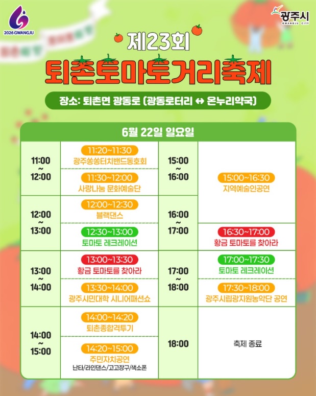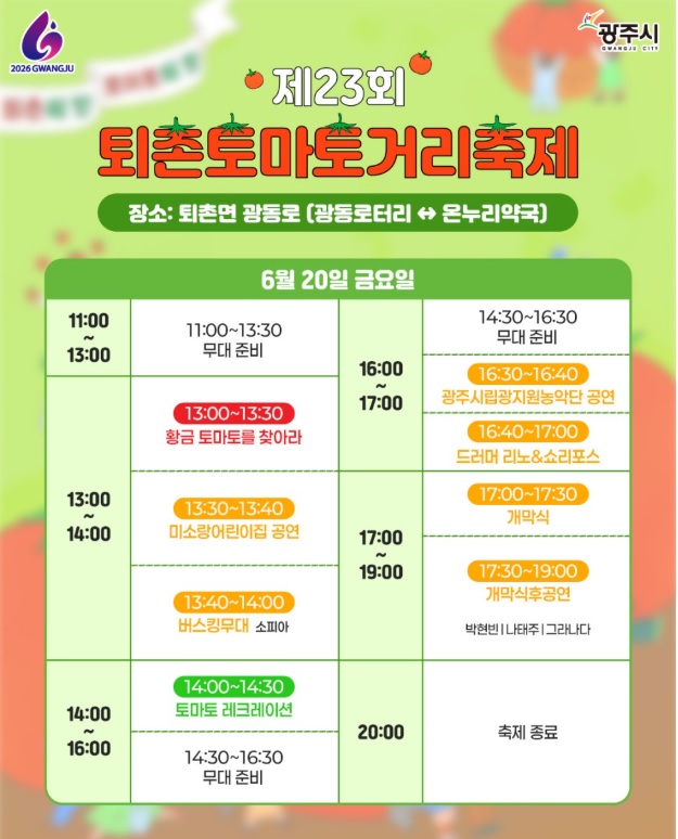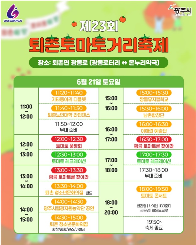 경기 광주시의 대표 여름 축제, 퇴촌토마토거리축제가 이번 주말 열립니다. 명품 토마토 풀장 체험부터 황금토마토 찾기, 지역 특산물 판매까지, 온 가족이 함께 즐길 수 있는 다채로운 프로그램과 풍성한 먹거리를 소개합니다. 주말 나들이를 계획하고 있다면 놓치지 마십시오.